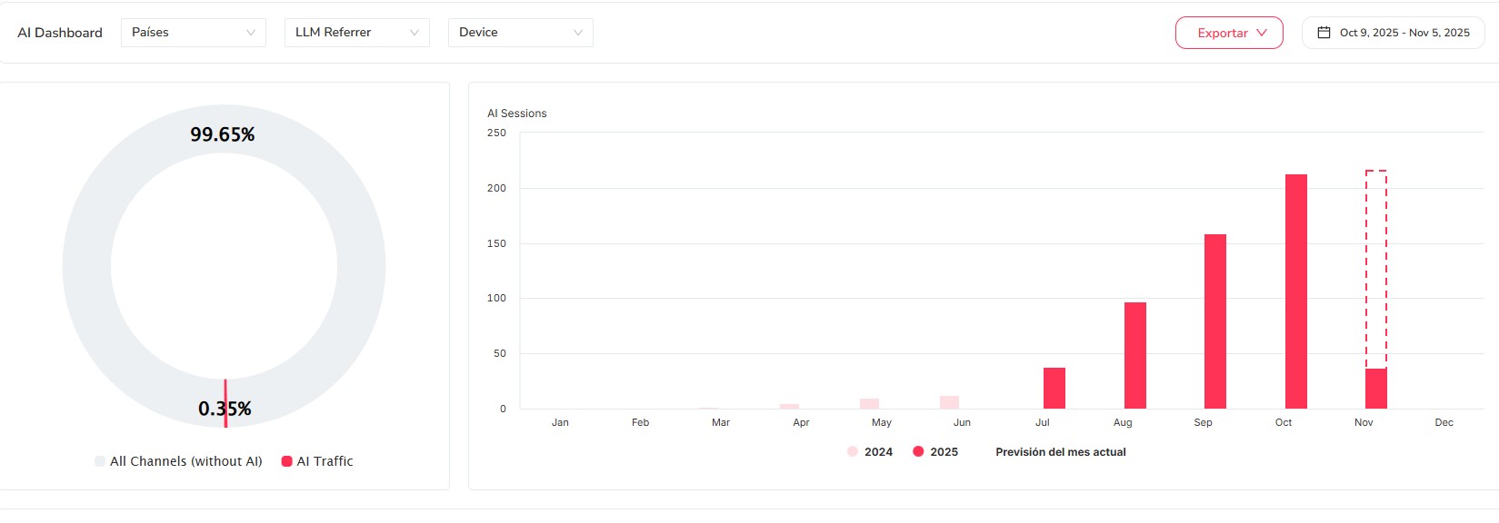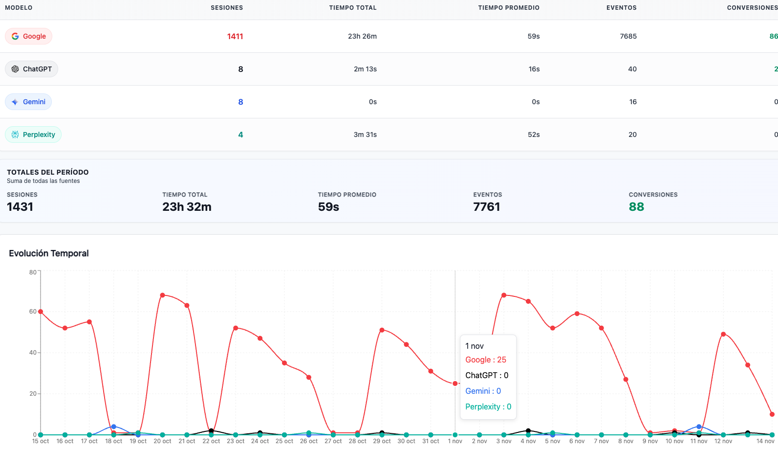 Podemos ver las visitas web desde cada plataforma de IA y los objetivos que alcanzamos como se aprecia en esta imagen