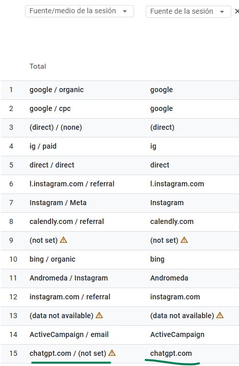 Si queremos medir el tráfico web y la visibilidad en estas plataformas tenemos que usar métricas desde diversas fuentes como Google Analytics 4 (GA4)usando filtros como la fuente que contiene chatgpt como se ve en la imagen extraída de GA4.