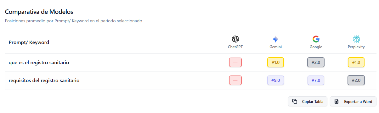 Permite ver la visibilidad de un prompt como en la siguiente imagen comparando entre Chatgpt, Gemini, Google y Perplexity como en las siguientes imágenes.Puedes descargar en formatos Word o tabla para exportar a Excel o Google Sheets.