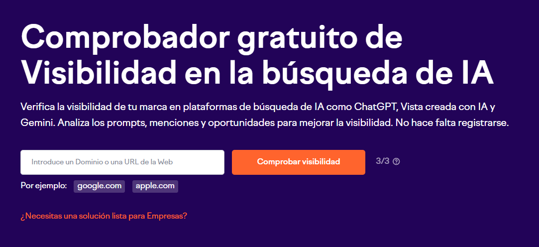 SEMrush tiene una herramienta gratuita de la visiblidad en la búsqueda de IA que verifica la visiblidad de tu marca en plataformas de busqueda de IA y permite introducir un dominio web y lo puedes usar hasta 3 veces de forma gratuita pero no me ha funcionado bien introduciendo algunos dominios en España ya que parece estar en desarrollo en el momento de escribir este artículo.
