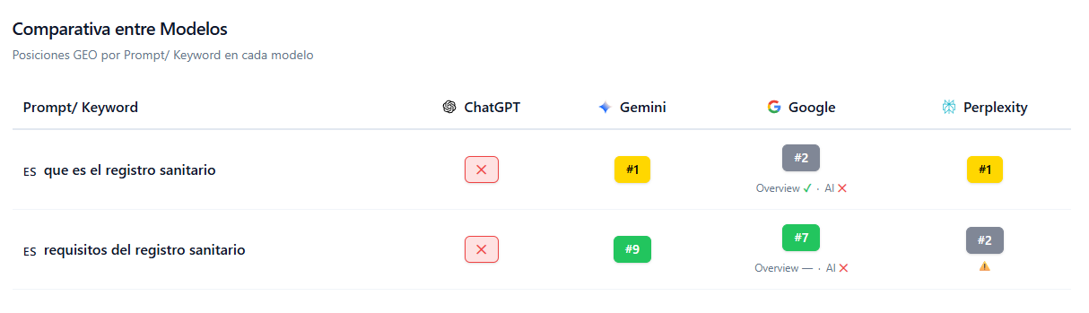 Podemos ver las posiciones GEO por prompt o keyword en cada modelo de IA como se ve en la imagen y el rendimiento así como los competidores y su ranking.