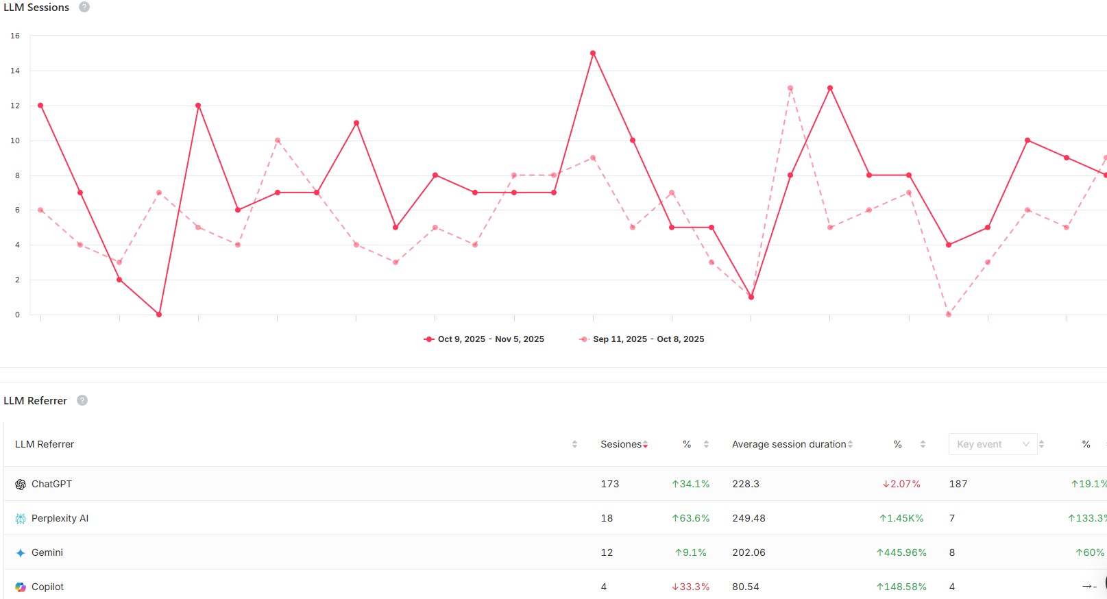 La herramienta SEOCrawl de la que hice un análisis en 2022 tiene un apartado para las visitas web que vienen desde modelos de IA (LLMSessions) que te muestra las sesiones, usuarios y conversiones o eventos clave como llamadas, formularios enviados o pedidos online que te permiten justificar la inversión en contenidos para ser citados en la IA con una evolución mensual y del último mes.