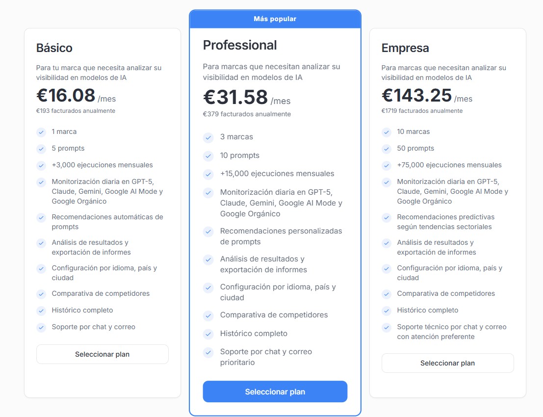 La herramienta se llama Airketing y tiene una prueba de 7 días sin pago con tres planes para seguimiento de visibilidad para una , tres o 10 marcas con un número proporcional de prompts que van desde los 16€ al mes para una sola marca en el plan básico.